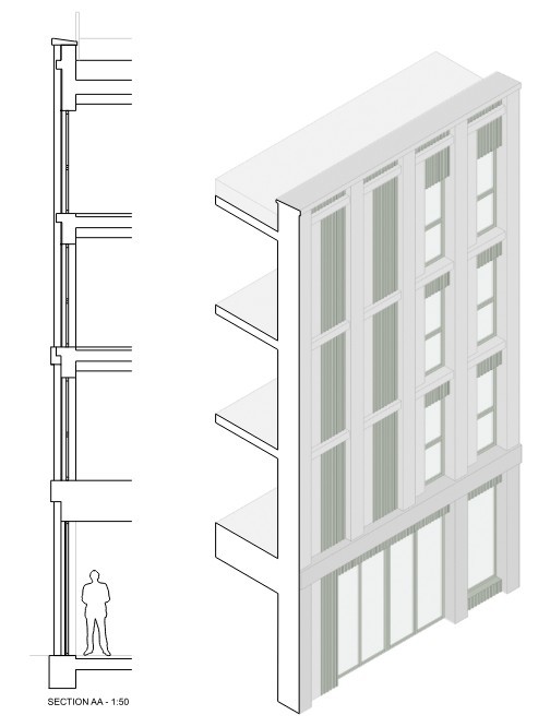 The treatment of the facade aims to pick up the successful elements of the previously consented scheme, such as the clear textured vertical elements and the additions of metal panelling with new additional elements to compliment and enhance the facade. The scheme presents stepped reveals and panels with a variation of hue, depth, texture and shadow. The facades are articulated across the scheme and broken into the elements of base, body, amenity and crown. This helps break the massing while complimenting the rhythm of the facades whilst enhancing active frontage and user experience.
